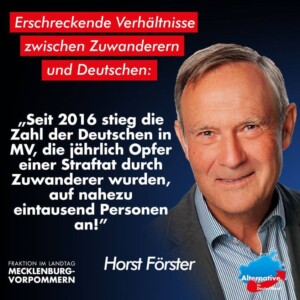 Laut Antwort der Landesregierung auf eine Kleine Anfrage der AfD-Fraktion wurden seit 2016 die Bürger Mecklenburg-Vorpommerns vier- bis fünfmal häufiger Opfer von Zuwandererkriminalität als umgekehrt.